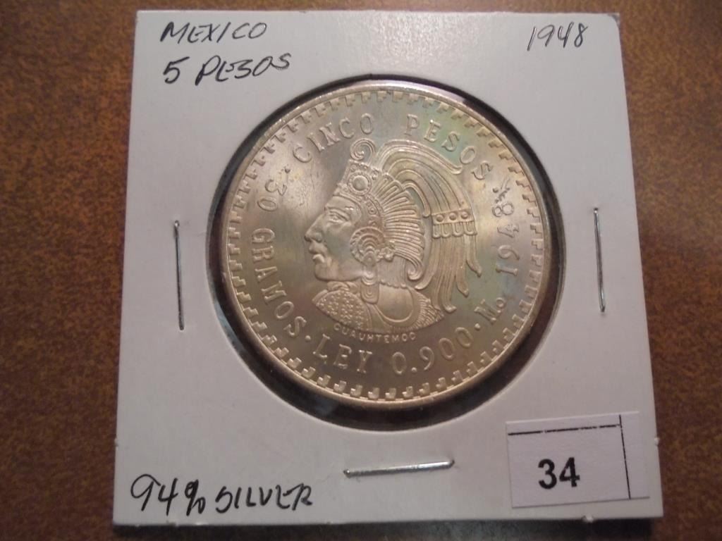 1948 MEXICO SILVER 5 PESOS UNC .8680 OZ. ASW