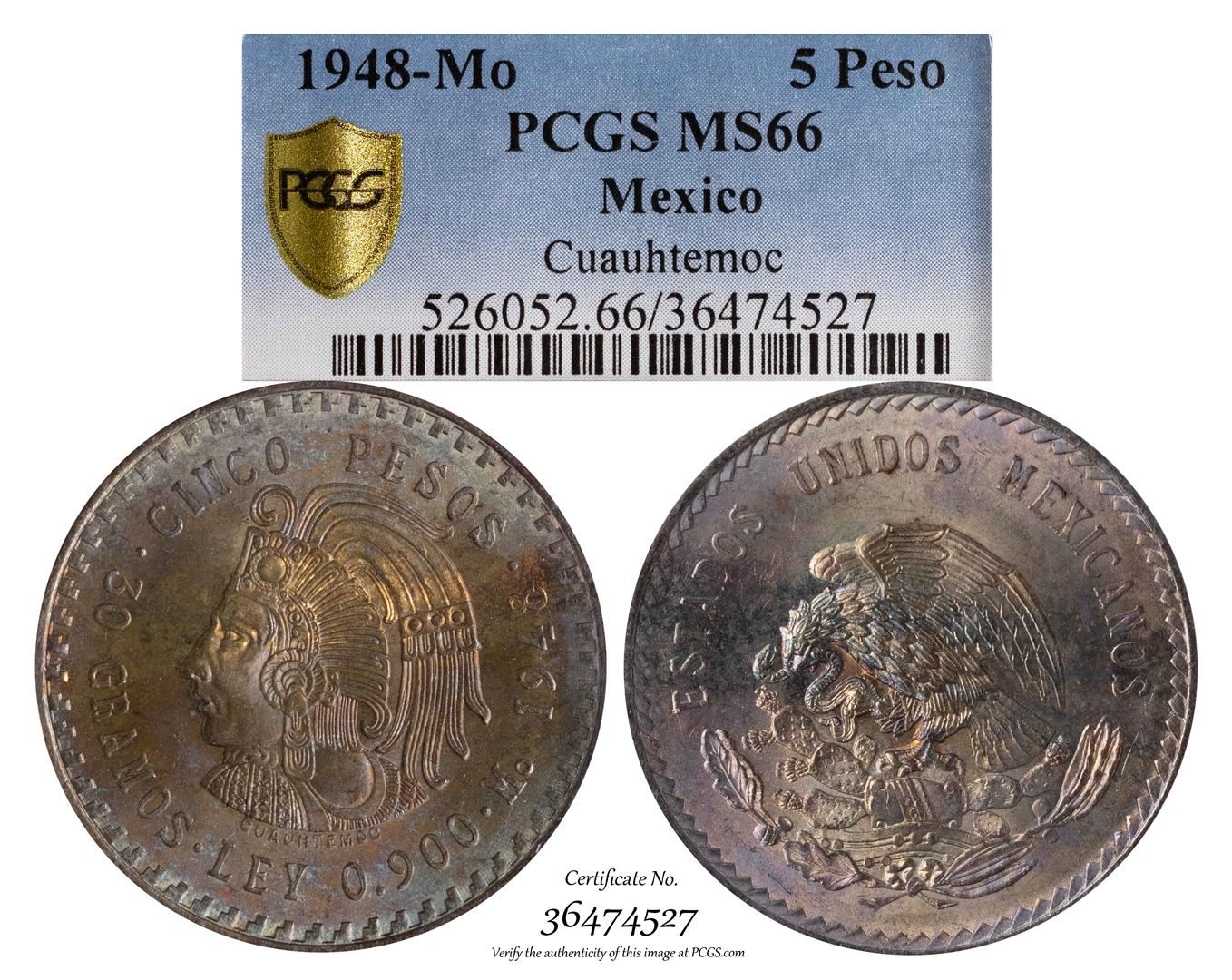 One 1948-MO 5 Pesos Mexico Coin PCGS MS66. PCGS Graded.