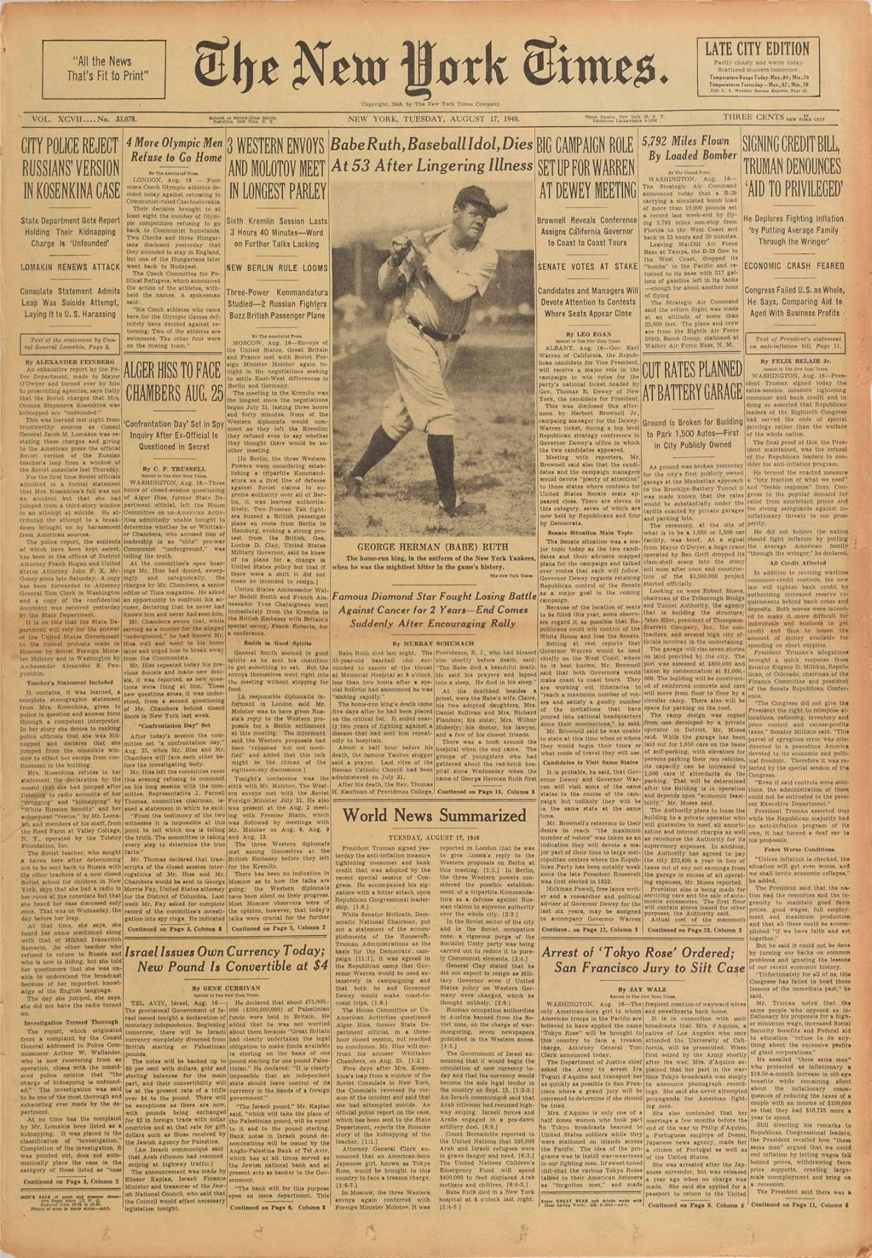 Complete issue of The New York Times from August 17, 1948, 44 pages,16.5 x 22.75, with a front-page image of Ruth taking a mighty swing, headlined: "Babe Ruth, Baseball Idol, Dies At 53 After Lingering Illness." Bound along the left edge and in very good to fine condition, with chipping to the toned and brittle edges.