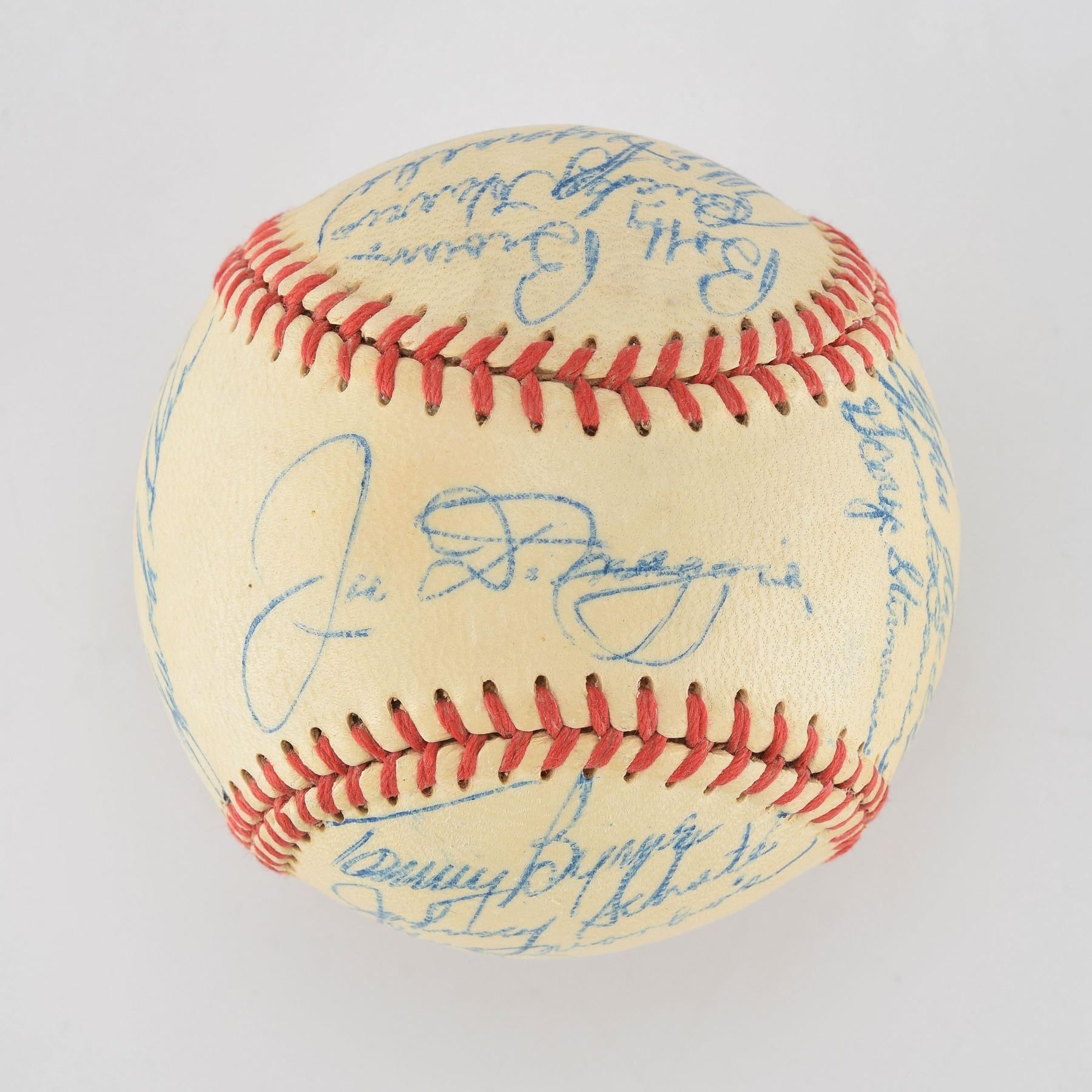 Offered is a 1948 New York Yankees team-signed baseball with bold, blue ink signatures including a very nice "Joe DiMaggio" on the sweet spot, in the Clipper's famous flowing script.