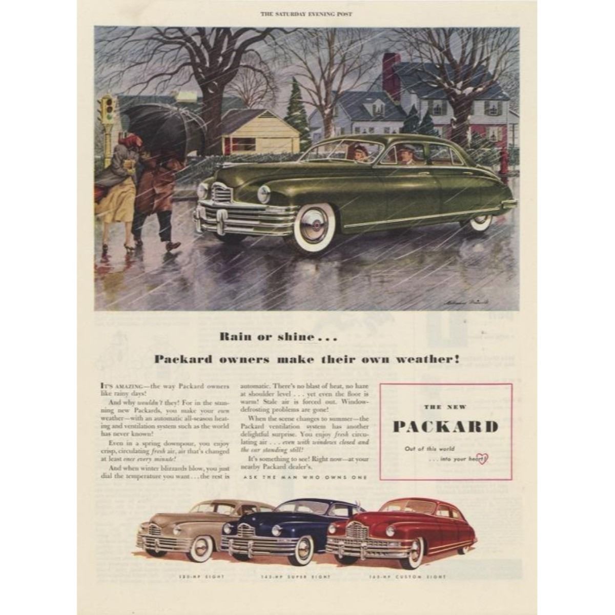 Original advertisement from a 1948 copy of "The Saturday Evening Post" Magazine. slogan reads, " Rain or shine... Packard owners make their own weather!". 10 1/2" X 13 1/2" mounted on linen canvas for preservation.