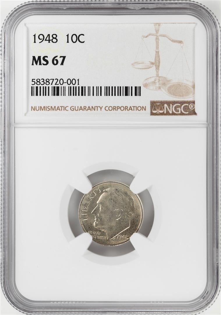 One 1948 Roosevelt Dime Coin NGC MS67. NGC Certified.