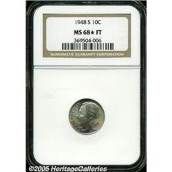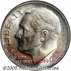 <B>1948-S 10C MS68 <img border='0' src='http://www.heritagecoins.com/images/star.gif' width=10 height=10> Full Torch NGC.</B></I> The luscious electric-green, purple-red, and apricot-orange patina that occupies the lower obverse of this sharply struck Superb Gem, helps to create the overall aesthetic appeal that makes the piece so compelling to look at. Undoubtedly, shimmering luster is another important attribute. When impeccable preservation is added, a rare marriage of technical perfection and stunning visual appeal is achieved. A seemingly unimprovable coin that is certainly one of the finest known.