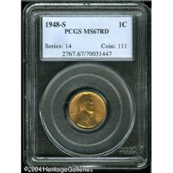 1948-S 1C MS67 Red PCGS. Attractive mint-green and <B>1948-S 1C MS67 Red PCGS.</B></I> Attractive mint-green and apricot-red colors adorn the satiny, fully lustrous surfaces of this boldly struck Superb Gem. There is a splash of pastel bluish-gray patina, near the center of the reverse. Obverse and reverse both seem blemish-free. <BR><BR><B>Important notice:</B> Heritage usually auctions material at the rate of 200-250 lots per hour. On some occasions eBay Live bid software or the Internet may not be able to keep up with the pace of the auction. We recommend placing a realistic absentee bid now as insurance to avoid disappointment. Occasionally the auctioneer may eliminate or reject an eBay Live bid, and the auctioneer may also reopen a lot after the close of the eBay live bidding (usually because we missed an audience bid), and may reject your bid even if it shows you as the winning bidder. By bidding via eBay Live, you agree that Heritage may award the lot to another bidder at its sole discretion under the circumstances described above or any other reasonable circumstances. Since eBay bids are not shown to us until we open the lot on the floor, we treat those bids just like floor bids. In most cases the floor responds before the eBay bid is presented to us, due to Internet lag time, so for consistency we have made it a policy that floor bids are always considered first over tie eBay live bids. Also please note that all Heritage lots purchased through eBay Live carry a 20% Buyer's Premium. Please make sure you read the Terms and Conditions before you bid. This lot is being auctioned in conjunction with a live floor auction by Heritage Galleries & Auctioneers. All final auction and invoice information will be supplied by Heritage Galleries & Auctioneers, and all other information should be considered preliminary. Lot:5370