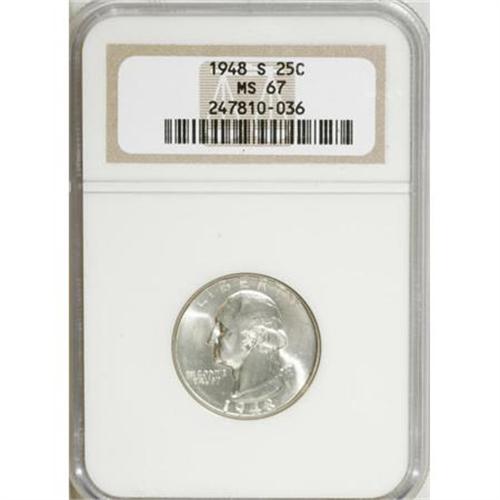 <B>1948-S 25C MS67 NGC.</B></I> . NGC Census: (249/1). PCGS Population (38/1). Mintage: 15,960,000. Numismedia Wsl. Price for NGC/PCGS coin in MS67: $185. (#5838)<BR><BR><B>Coin Engraver:</B> John Flanagan<BR><BR><b>Shipping:</b> Coins & Currency (<a target="_blank" href="http://www.heritageauctions.com/common/shipping.php">view shipping information</a>)