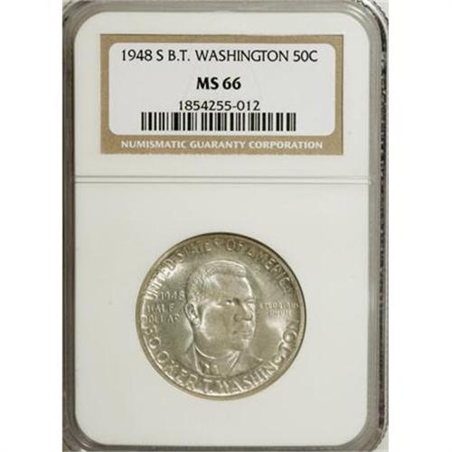 <B>1948-S 50C Booker T. Washington MS66 NGC.</B></I> NGC Census: (262/38). PCGS Population (176/3). Mintage: 8,005. Numismedia Wsl. Price for NGC/PCGS coin in MS66: $240. (#9414)<BR><I>From The Frank DuVall Collection of U.S. Commemoratives.</B></I><BR><BR><b>Shipping:</b> Coins & Currency (<a target="_blank" href="http://www.heritageauctions.com/common/shipping.php">view shipping information</a>)