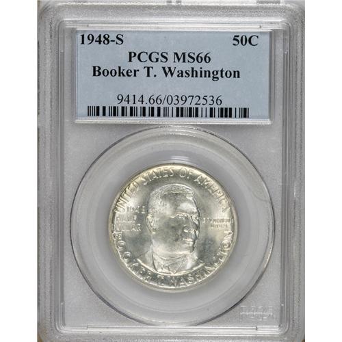<B>1948-S 50C Booker T. Washington MS66 PCGS.</B></I> PCGS Population (175/3). NGC Census: (253/34). Mintage: 8,005. Numismedia Wsl. Price: $240. (#9414)<BR><BR><b>Shipping:</b> Coins & Currency (<a target="_blank" href="http://www.heritageauctions.com/common/shipping.php">view shipping information</a>)