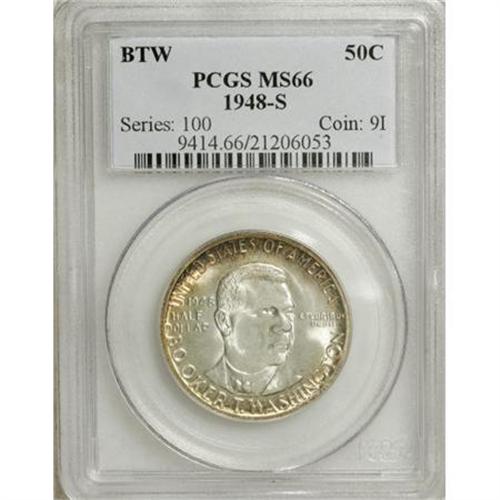 <B>1948-S 50C Booker T. Washington MS66 PCGS.</B></I> PCGS Population (176/3). NGC Census: (259/37). Mintage: 8,005. Numismedia Wsl. Price for NGC/PCGS coin in MS66: $240. (#9414)<BR><BR><b>Shipping:</b> Coins & Currency (<a target="_blank" href="http://www.heritageauctions.com/common/shipping.php">view shipping information</a>)