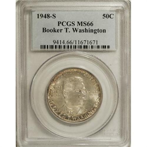 <B>1948-S 50C Booker T. Washington MS66 PCGS.</B></I> PCGS Population (176/3). NGC Census: (262/38). Mintage: 8,005. Numismedia Wsl. Price for NGC/PCGS coin in MS66: $240. (#9414)<BR><BR><b>Shipping:</b> Coins & Currency (<a target="_blank" href="http://www.heritageauctions.com/common/shipping.php">view shipping information</a>)