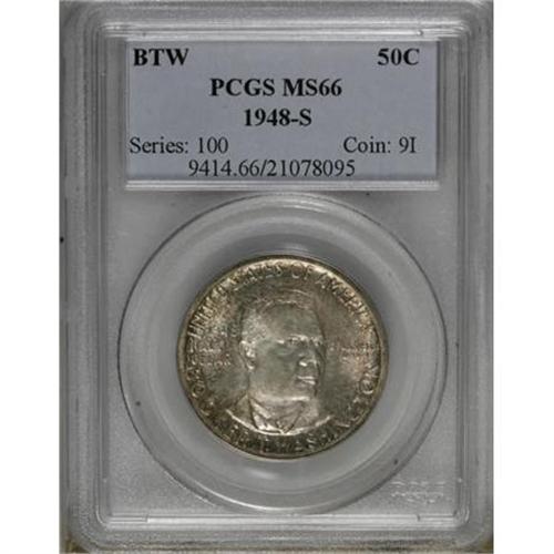<B>1948-S 50C Booker T. Washington MS66 PCGS.</B></I> PCGS Population (205/4). NGC Census: (271/38). Mintage: 8,005. Numismedia Wsl. Price for NGC/PCGS coin in MS66: $240. (#9414)<BR><BR><b>Shipping:</b> Coins & Currency (<a target="_blank" href="http://www.heritageauctions.com/common/shipping.php">view shipping information</a>)