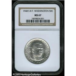 <B>1948-S 50C Booker T. Washington MS67 NGC.</B></I> Blazing white surfaces are awash in luster, and reveal just a couple of miniscule marks on the cheek of the obverse portrait. Magnificent overall eye appeal. Population: 15 in 67, 1 finer (1/05). Lot:8614