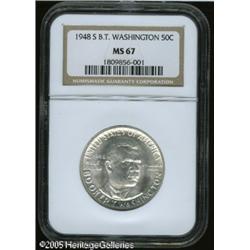 <B>1948-S 50C Booker T. Washington MS67 NGC.</B></I> Radiant luster emanates from untoned surfaces. The design elements are sharply struck, and just a few hardly noticeable marks on Washington's face are mentioned for accuracy. Population: 15 in 67, 1 finer (1/05). Lot:8613