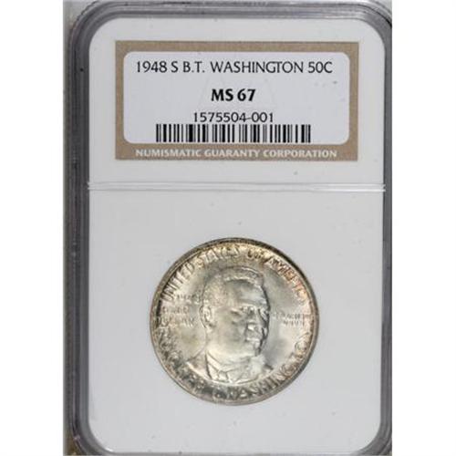 <B>1948-S 50C Booker T. Washington MS67 NGC.</B></I> NGC Census: (37/1). PCGS Population (3/0). Mintage: 8,005. (#9414)<BR><BR><b>Shipping:</b> Coins & Currency (<a target="_blank" href="http://www.heritageauctions.com/common/shipping.php">view shipping information</a>)