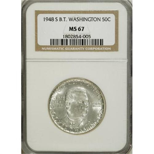 <B>1948-S 50C Booker T. Washington MS67 NGC.</B></I> An essentially brilliant and carefully preserved example of this mid-date Booker T. Washington issue, one of just 8,000 examples distributed in three-coin sets. A mark appears on Washington's chin, though this was present on the planchet prior to striking. NGC has graded only one numerically finer representative (3/08).<BR><BR><b>Shipping:</b> Coins & Currency (<a target="_blank" href="http://www.heritageauctions.com/common/shipping.php">view shipping information</a>)