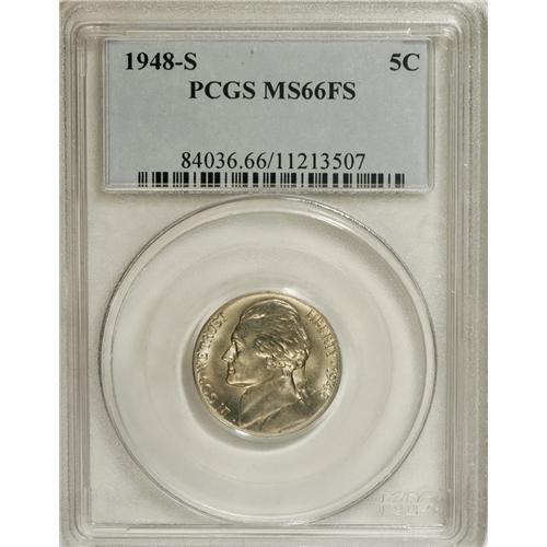 <B>1948-S 5C MS66 Full Steps PCGS.</B></I> PCGS Population (0/0). NGC Census: (15/0). (#84036)<BR><BR><b>Shipping:</b> Coins & Currency (<a target="_blank" href="http://www.heritageauctions.com/common/shipping.php">view shipping information</a>)
