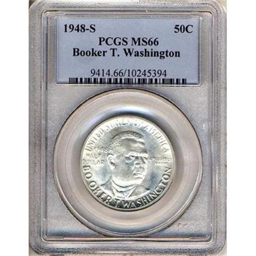 <b>1948-S Booker T. Washington Half Dollar. PCGS graded MS66.</b> Flashy frosty coin with full untoned brilliance. A low mintage year <b>(PCGS # 9414)</b> <i>