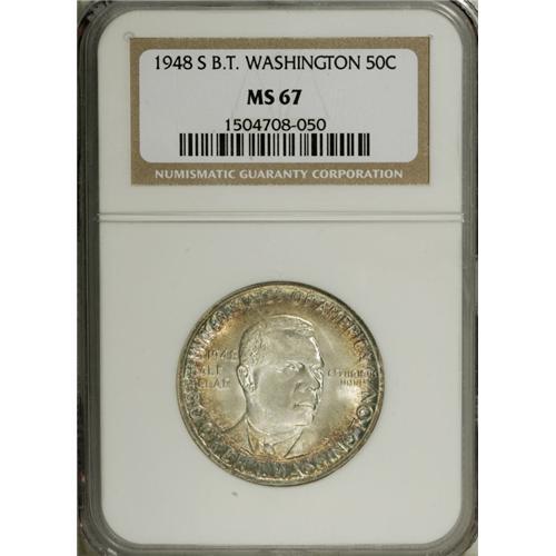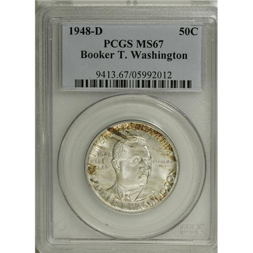 <B>1948 SET Booker T. Washington PDS Set.</B></I> The set includes: <B>1948 MS66 NGC,</B></I> sun-gold peripheral toning bounds the slate-gray centers; <B>1948-D MS67 PCGS,</B></I> dashes of honey and jade adorn the margins, well struck; and a <B>1948-S MS67 NGC,</B></I> chestnut-gold and aqua-green borders gradually cede to untoned centers.<BR><BR><b>Shipping:</b> Coins & Currency (<a target="_blank" href="http://www.heritageauctions.com/common/shipping.php">view shipping information</a>)