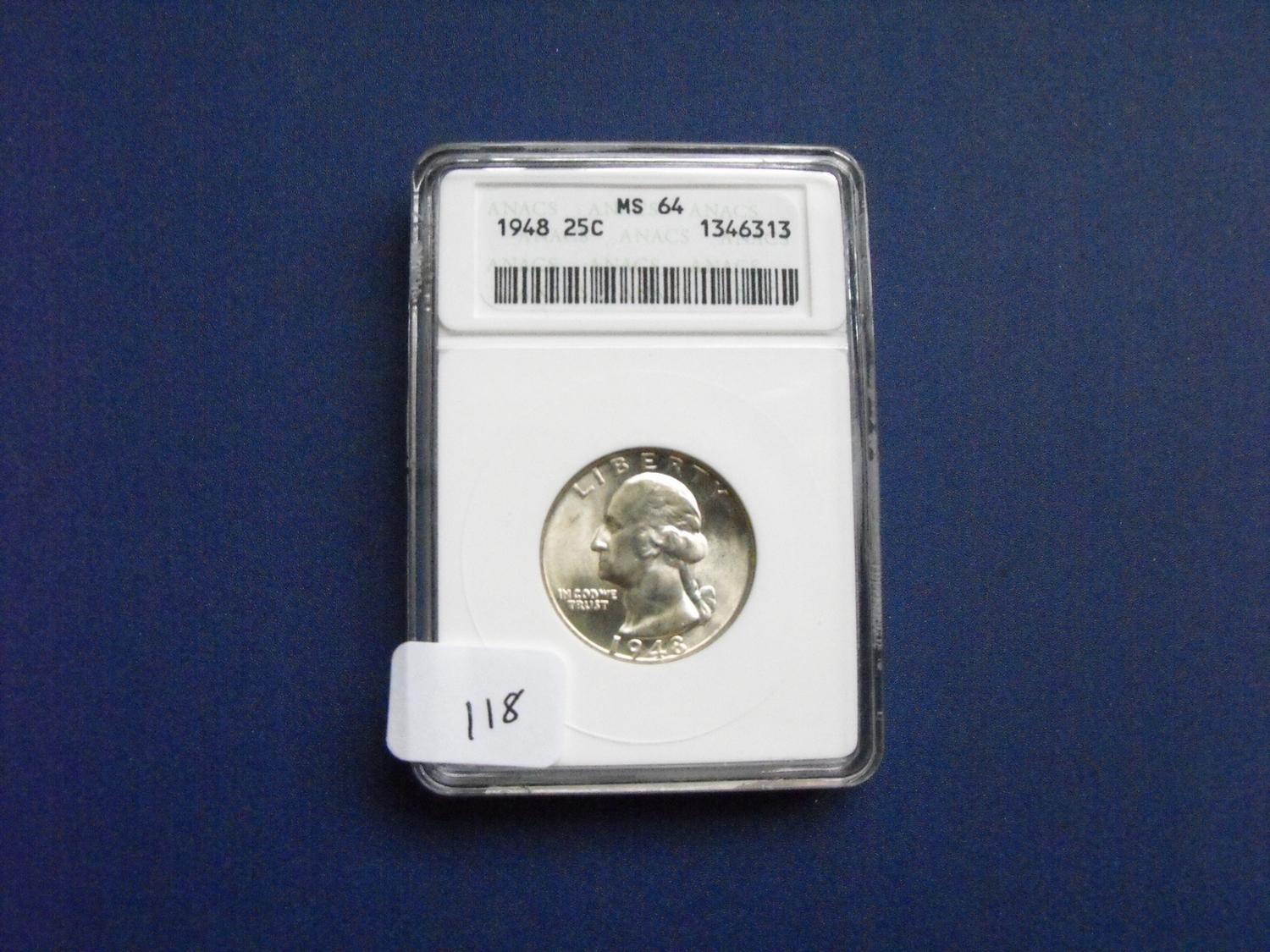 1948 SILVER QUARTER MS 64 ANACS