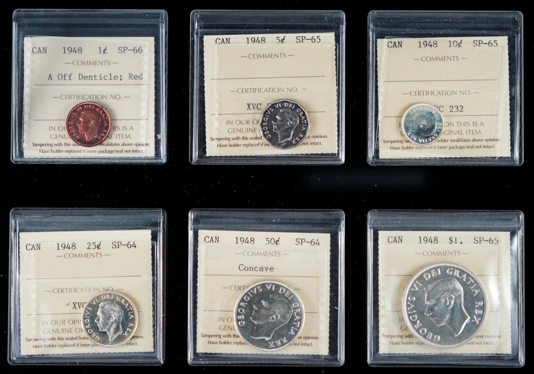 1948 SPECIMEN SET; A superb and complete 6 coin set. All ICCS graded Choice Mint State -64 to Superb Gem Mint State-66. The cent is Full Red and the silver coins are brilliant with great reflective surfaces. Housed in deluxe homemade black leather case.