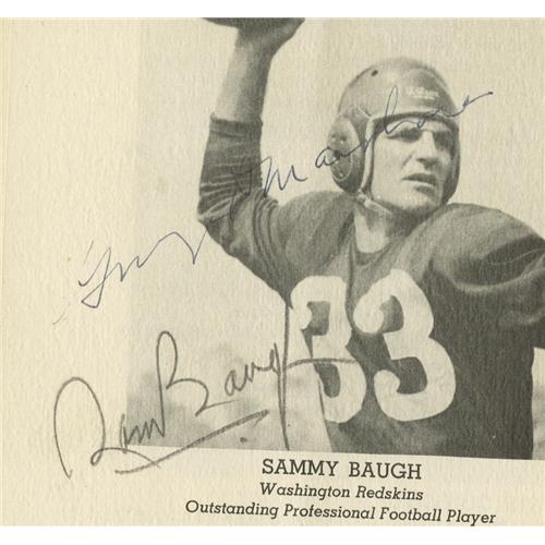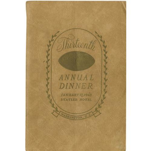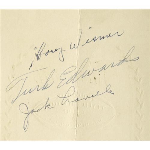 <B>1948 The Touchdown Club Signed Program with Edwards & Marshall.</B></I> Some tough early Football Hall of Fame autographs make this rare program for the venerable club's Thirteenth Annual Dinner a hot commodity among collectors of gridiron ink. Best are the signatures of local Washington Redskins Hall of Famers Turk Edwards and George Marshall, each of whom rate among the tougher autographs in the football collecting hobby. Chuck Bednarik and Sammy Baugh are other legends among the nine NRMT autographs located within the pages of this thirty-two page program. The interior pages have come loose from the cover, and a single horizontal crease passes through the center, though these factors do not have a significant effect upon the autographs. <I>LOA from PSA/DNA.</B></I> <BR><BR><B>Important notice:</B> Heritage usually auctions material at the rate of 200-250 lots per hour. On some occasions eBay Live bid software or the Internet may not be able to keep up with the pace of the auction. We recommend placing a realistic absentee bid now as insurance to avoid disappointment. Occasionally the auctioneer may eliminate or reject an eBay Live bid, and the auctioneer may also reopen a lot after the close of the eBay live bidding (usually because we missed an audience bid), and may reject your bid even if it shows you as the winning bidder. By bidding via eBay Live, you agree that Heritage may award the lot to another bidder at its sole discretion under the circumstances described above or any other reasonable circumstances. Since eBay bids are not shown to us until we open the lot on the floor, we treat those bids just like floor bids. In most cases the floor responds before the eBay bid is presented to us, due to Internet lag time, so for consistency we have made it a policy that floor bids are always considered first over tie eBay live bids. Also please note that all Heritage lots purchased through eBay Live carry a 22.5% Buyer's Premium. Please make sure you read the Terms and Conditions before you bid. This lot is being auctioned in conjunction with a live floor auction by Heritage Galleries & Auctioneers. All final auction and invoice information will be supplied by Heritage Galleries & Auctioneers, and all other information should be considered preliminary. Lot:19286 <BR><BR><B>Winning Notification and Billing:</B> After the FINAL session in this auction is complete, Heritage will send e-mail and snail mail invoices. This process normally takes several days. All final auction and invoice information will be supplied by Heritage Galleries & Auctioneers, and all other information should be considered preliminary. <BR><BR>This auction will be conducted on a live auction floor and over the Internet through eBay Live. If you choose to place an absentee bid, please take a moment to <font color='#0000ff'><u><a href='http://pages.ebay.com/liveauctions/help/before/laabsentee.html'>learn how eBay Live absentee bidding works</a></u></font><font color='#000000'>