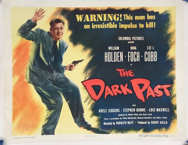 Original one sheet, linen backed, movie poster for "The Dark Past" starring William Holden, Nina Foch and Lee J. Cobb. 49/13.1948 Columbia Pictures. No creases. Minor tear at the top edge. Minor creasing on the edges. Near mint condition. The film tells the story of Al Walker (Holden), a convicted murderer who escapes from prison and takes refuge in a small town. Walker befriends Dr. Andrew Collins (Cobb), a police psychiatrist who is trying to help him turn his life around. However, Walker's past soon catches up to him, and he is forced to confront his demons.