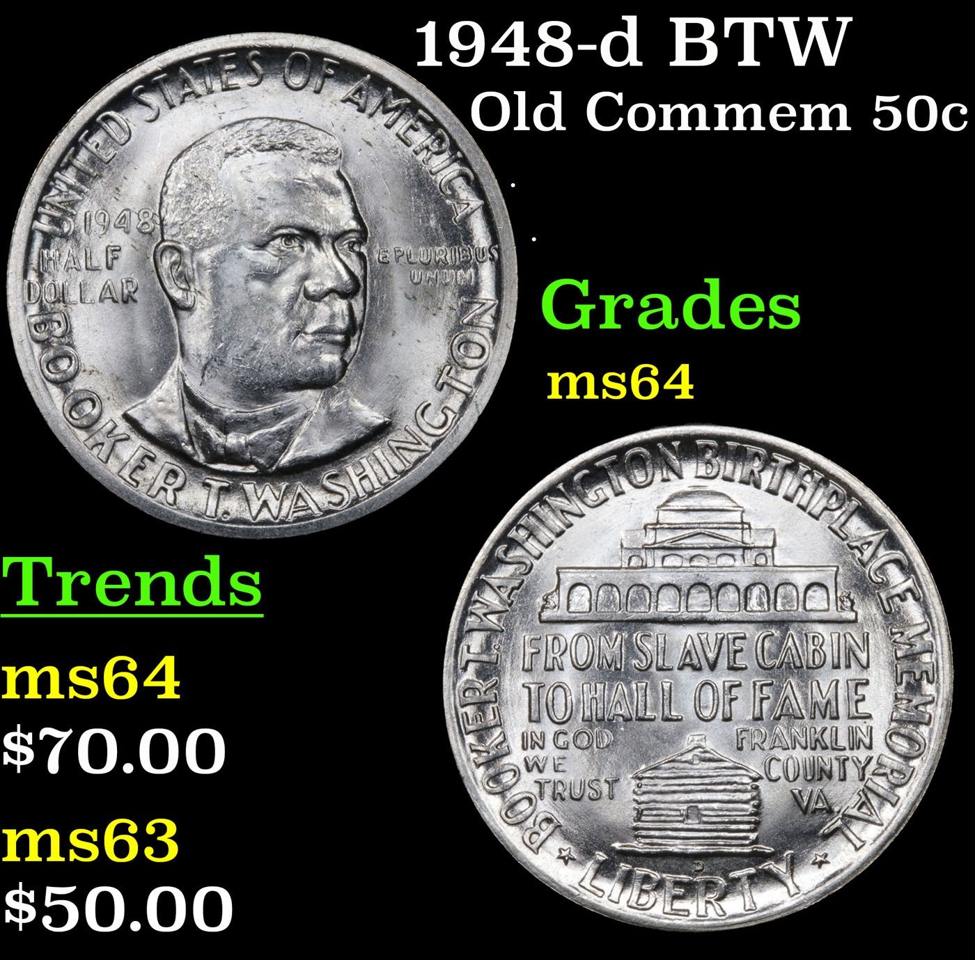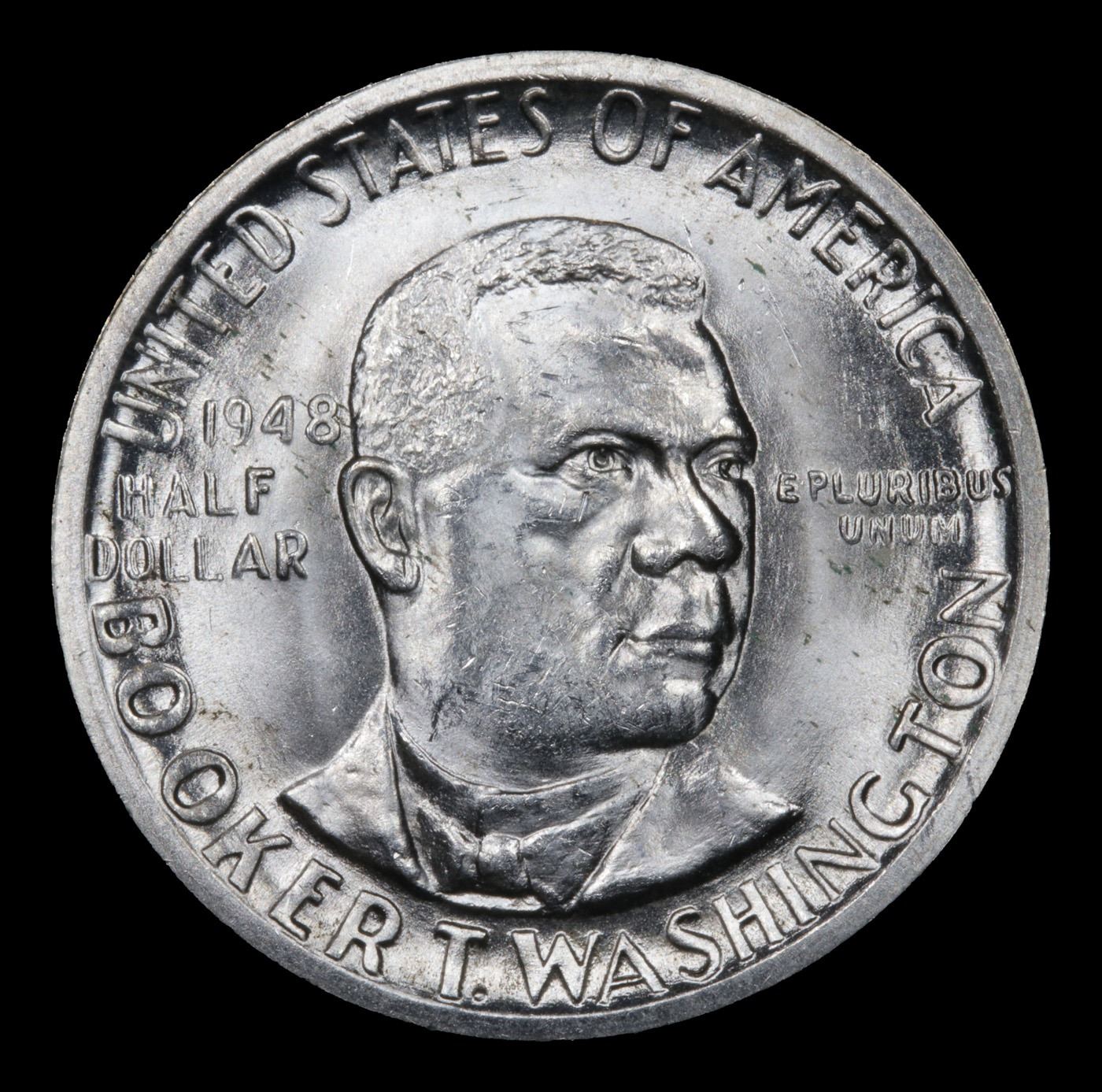 1948-d BTW Old Commem Half Dollar 50c Grades Choice Unc. When examining a Booker T. Washington commemorative look for wear on the high points, on the obverse that is Mr. Washington's right Cheek (from his perspective), and on the reverse the arches on the top building.