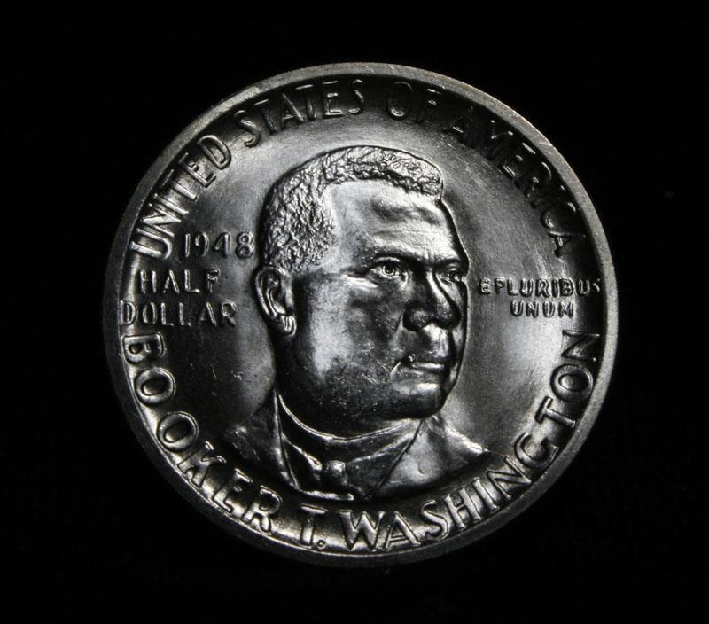 Blast White and lustrous example. Very clean example. The 48 is a much scarcer variety. When examining a Booker T. Washington commemorative look for wear on the high points, on the obverse that is Mr. Washington's right Cheek (from his perspective), and on the reverse the arches on the top building. Coin World's Coin Values lists ms65 at $110. The Wholesale Greysheet lists ms65 at $90. Estimated Value $100