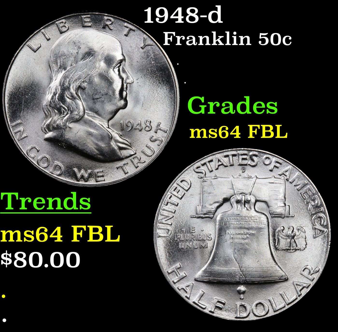1948-d Franklin Half Dollar 50c Grades Choice Unc FBL.