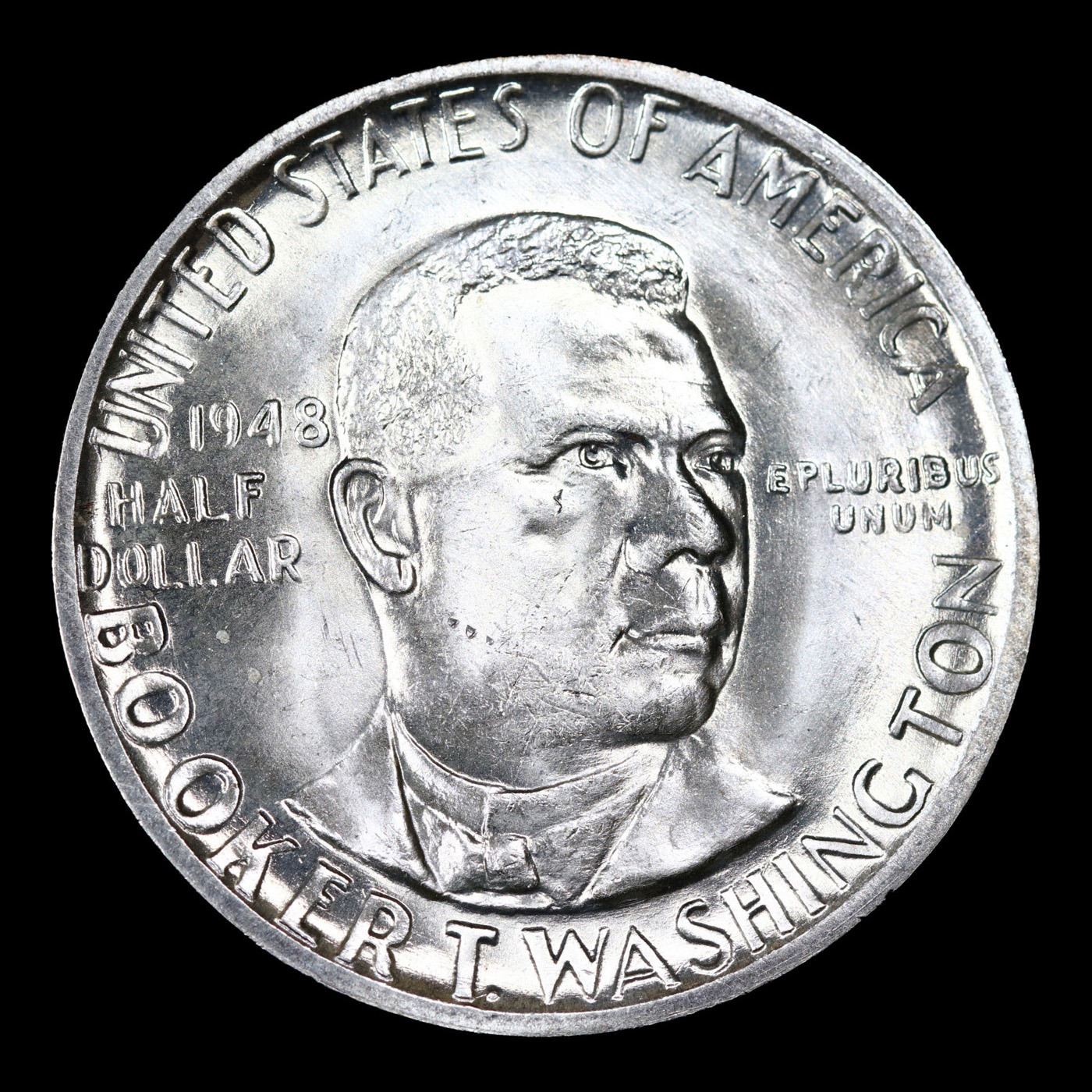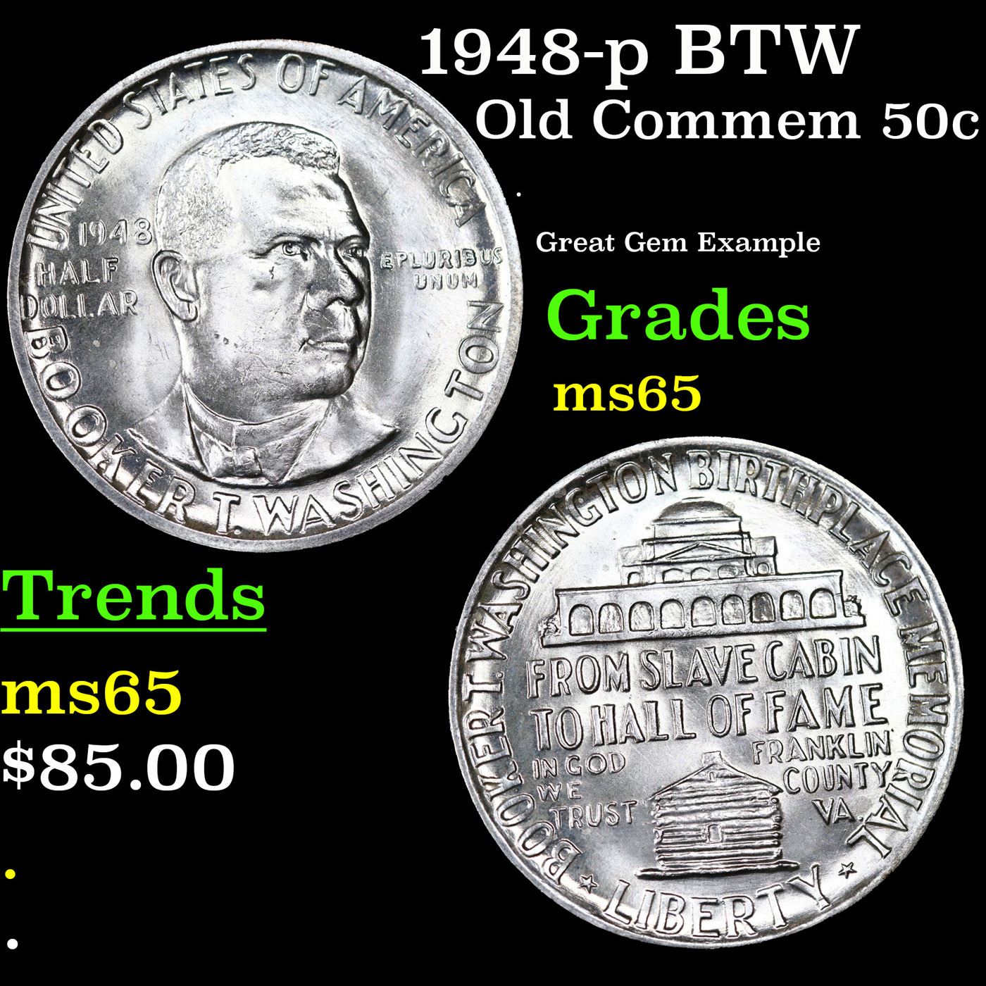 1948-p BTW Old Commem Half Dollar 50c Grades GEM Unc. When examining a Booker T. Washington commemorative look for wear on the high points, on the obverse that is Mr. Washington's right Cheek (from his perspective), and on the reverse the arches on the top building.