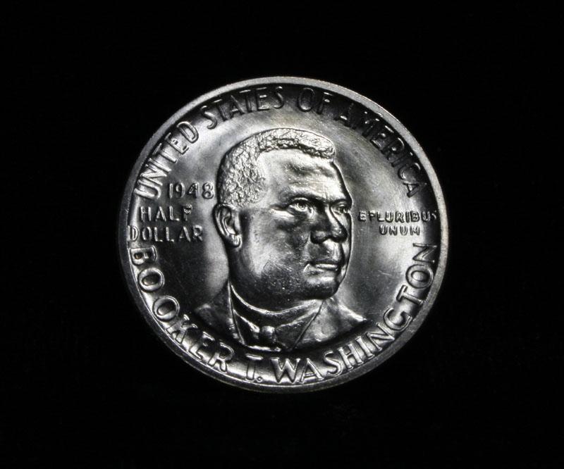 Very attractive and lustrous example. The 48 is a much scarcer variety. When examining a Booker T. Washington commemorative look for wear on the high points, on the obverse that is Mr. Washington's right Cheek (from his perspective), and on the reverse the arches on the top building. Coin World's Coin Values lists ms64 at $100. The Wholesale Greysheet lists ms64 at $75. Estimated Value $90