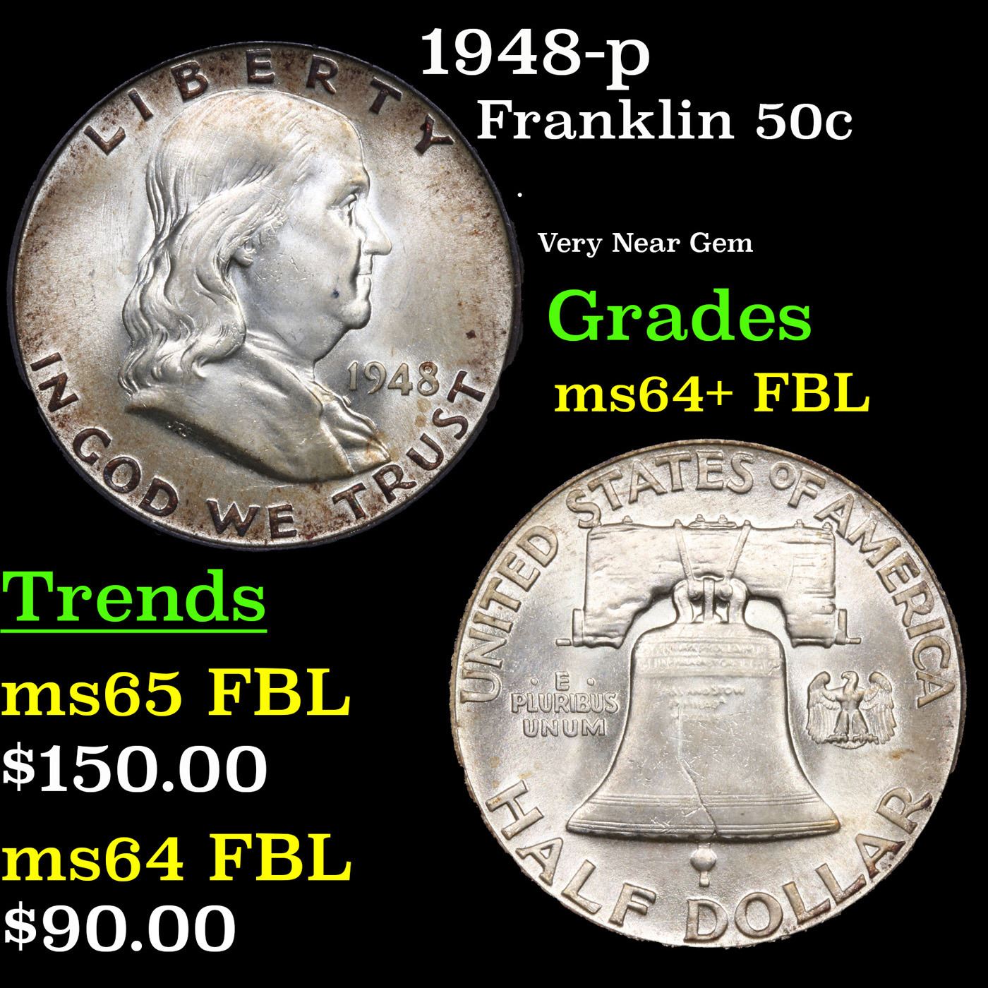 1948-p Franklin Half Dollar 50c Grades Choice Unc+ FBL.