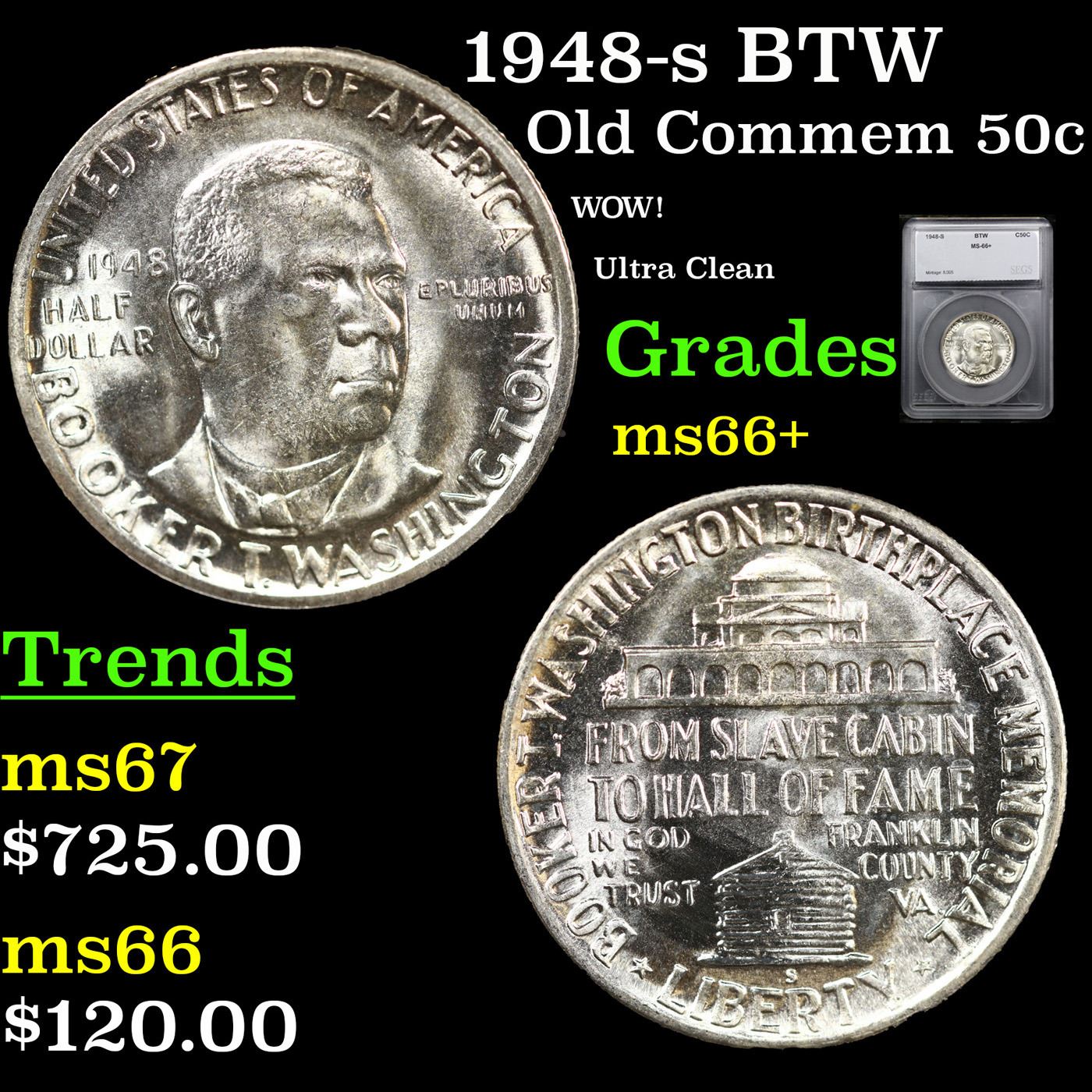 1948-s BTW Old Commem Half Dollar 50c Graded ms66+ By SEGS. When examining a Booker T. Washington commemorative look for wear on the high points, on the obverse that is Mr. Washington's right Cheek (from his perspective), and on the reverse the arches on the top building. A Corey's Pick, Bid to Win, Don't let it get Away Coin