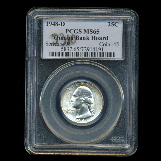 1948D Washington 25c Quarter Coin Graded PCGS MS65 Omaha Bank Hoard (COI-5310)