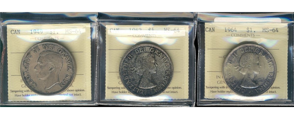 1949 $1, 1962 & 1964 ICCS MS64. Lot of 3 coins.