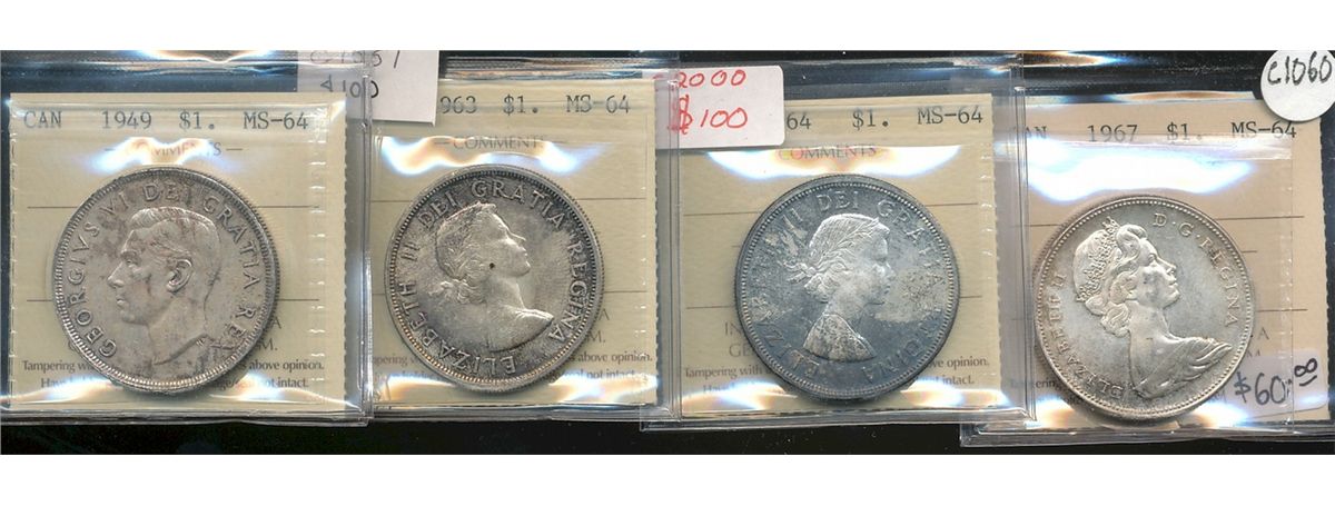 1949 $1, 1963, 1964 & 1967 ICCS MS64. Lot of 4 coins.