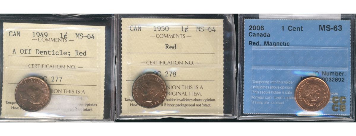 1949 1¢ A Off, 1950 both ICCS MS64RD & 2006 Magn CCCS MS63RD. Lot of 3 coins.