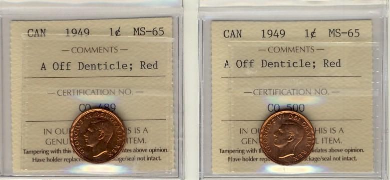1949 1¢ A Off Dent ICCS MS65RD. Lot of 2 coins all red.