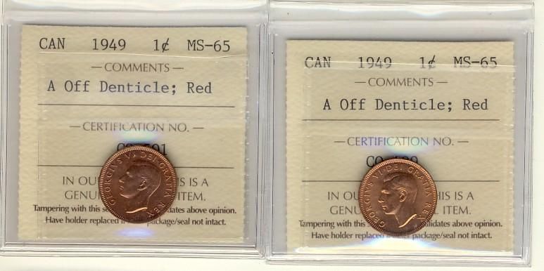1949 1¢ A Off Dent ICCS MS65RD. Lot of 2 coins all red.