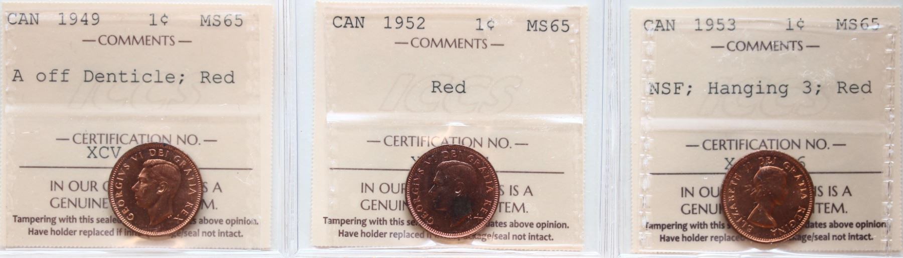 1949 1¢ "A off", 1952, 1953 "NSF - Hanging 3", Lot of 3 coins ICCS Gem Mint State-65 Red.