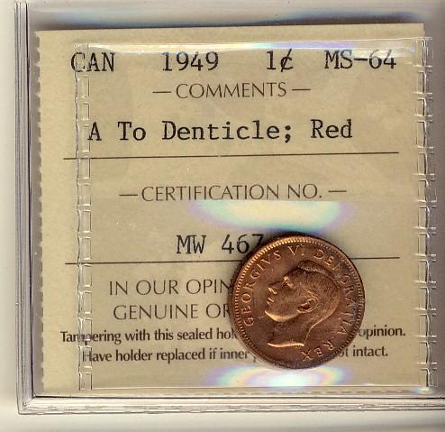 1949 1¢ A to Dent ICCS MS64RD. Better type in Mint state.