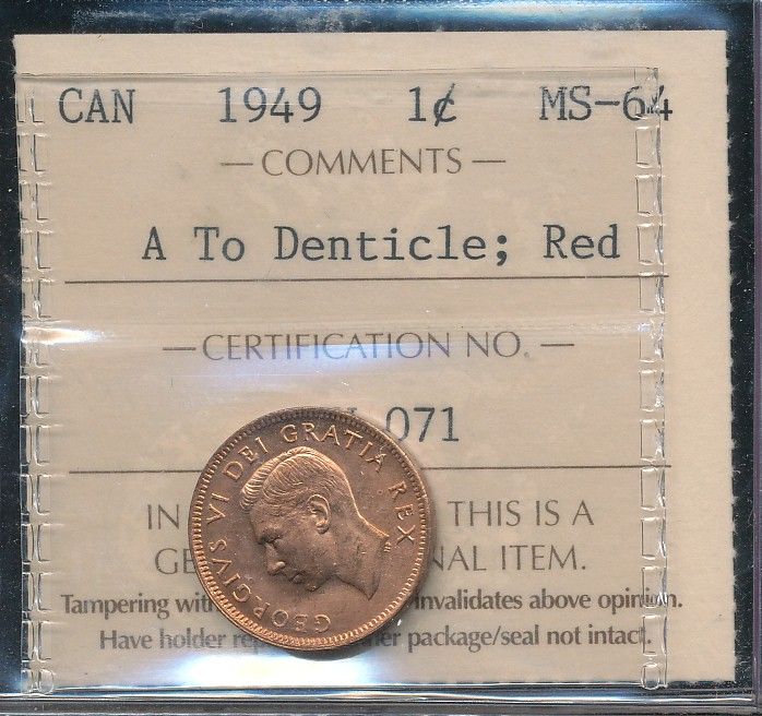1949 1¢ A to Dent ICCS MS64RD. Popular issue.
