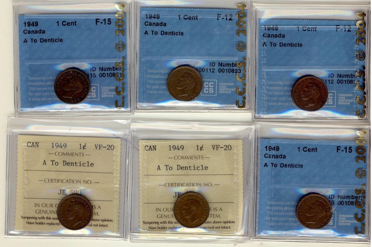 1949 1¢ A to Denticle CCCS F12 x2, CCCS F15 x2