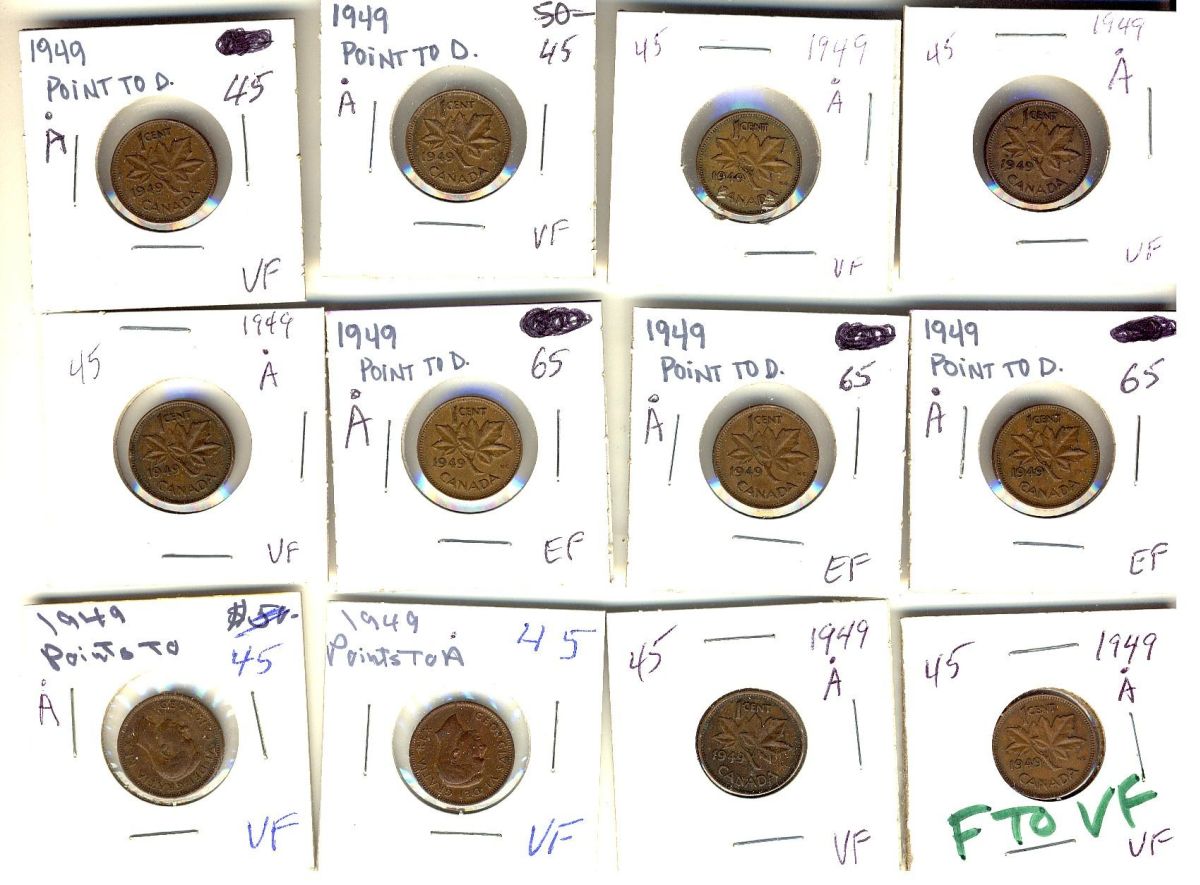 1949 1¢ A to Denticle. Lot of 12 coins all A to Dent. F to VF. Should be viewed.