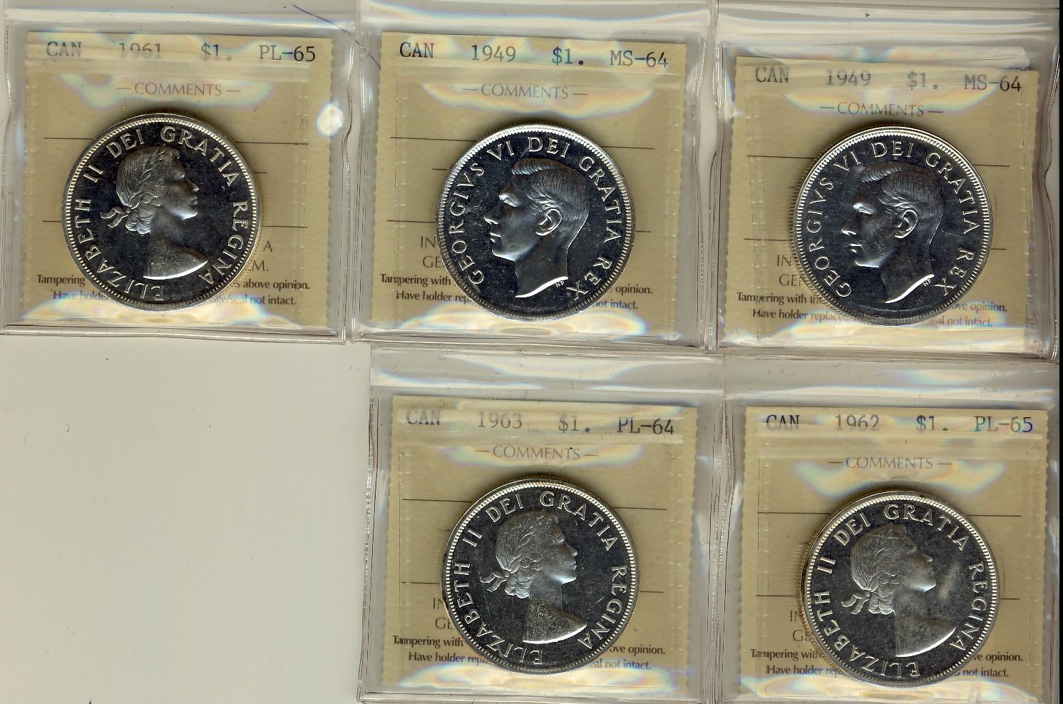 1949 $1 MS64(2), 1961 & 1962 PL65 and 1963 PL64 $1.  Lot of 5 ICCS graded coins.