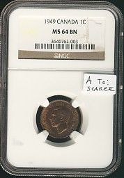 1949 1¢ NGC MS64BN. Should be designated as A to Denticle and RB wit lustre.