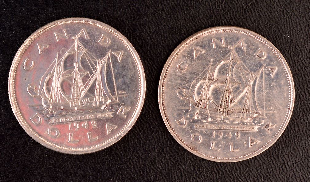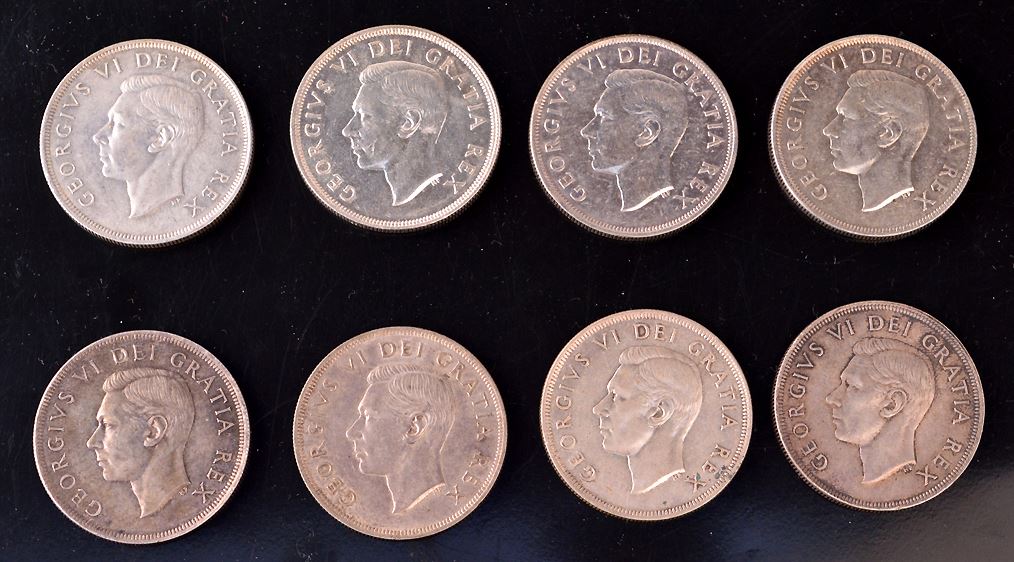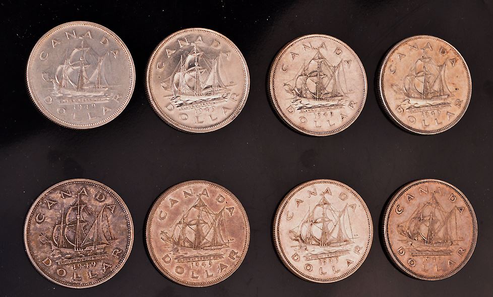 Silver Dolars, 1949, Newfoundland Commemorative, VF to AU. 8 pcs.