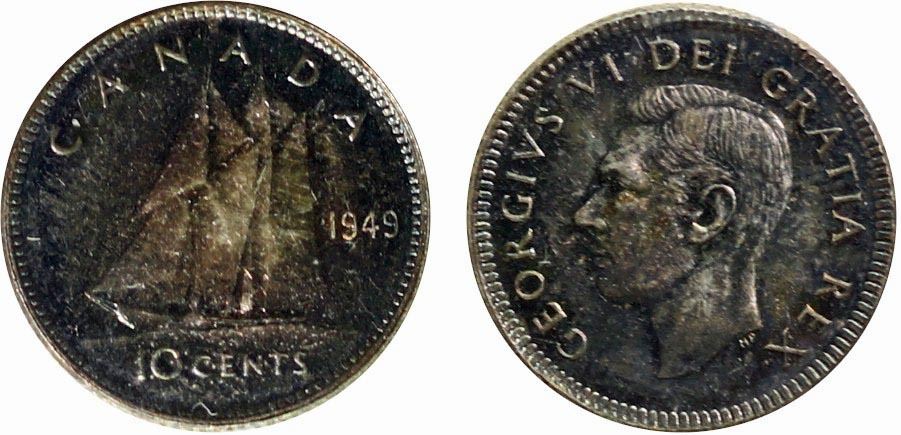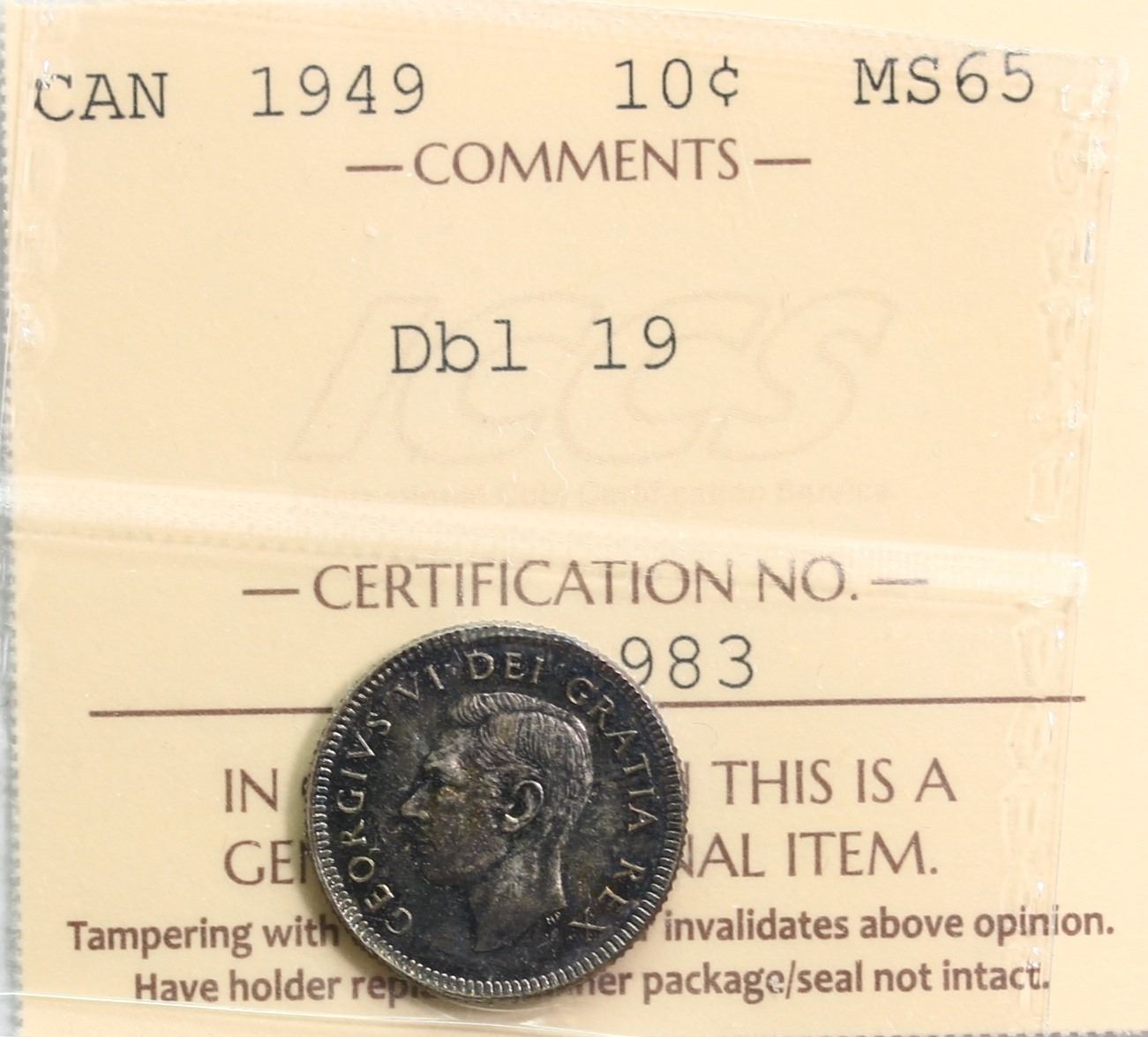 1949 10¢ "Dbl 19" ICCS Gem Mint State-65, Intense shades over full underlying lustre. A very interesting variety. A 1938 "Dbl 193" in Choice Mint State-64 brought it $896 at the 2025 Summer Sale.