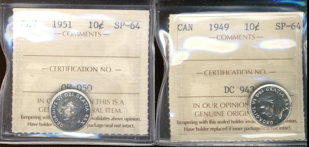 1949 10¢ ICCS SP64, 1951 10¢ ICCS SP64 Lot of 2 coins