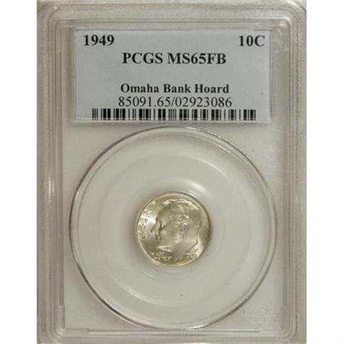 <B>1949 10C MS65 Full Bands PCGS.</B></I> Omaha Bank Hoard. PCGS Population (14/36). NGC Census: (0/0). Mintage: 30,940,000. (#85091)<BR><BR><B>Coin Engraver:</B> John R. Sinnock<BR><BR><b>Shipping:</b> Coins & Currency (<a target="_blank" href="http://www.heritageauctions.com/common/shipping.php">view shipping information</a>)