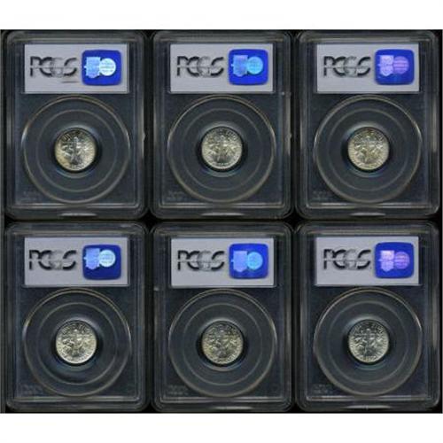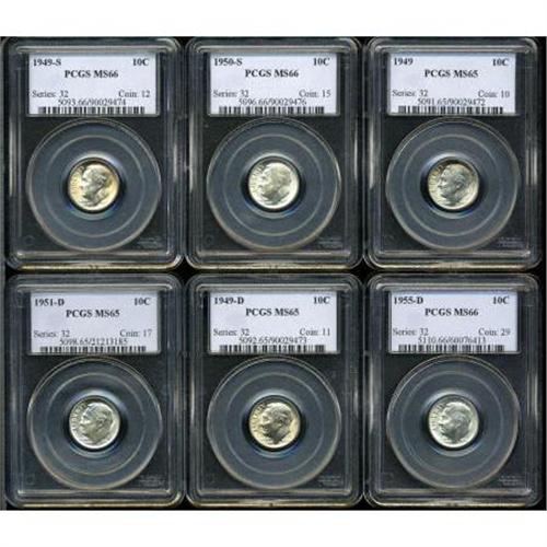 <B>1949 10C MS65 PCGS; 1949-D MS65 PCGS; 1949-S MS66 PCGS; 1950-S MS66 PCGS; 1951-D MS65 PCGS and a 1955-D MS66 PCGS.</B></I><BR><BR><B>Coin Engraver:</B> John R. Sinnock<BR><BR><b>Shipping:</b> Coins & Currency (<a target="_blank" href="http://www.heritageauctions.com/common/shipping.php">view shipping information</a>)
